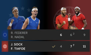 比赛依然好看而激烈。直至午夜过后,索克最后的一击锁定胜利。4-6 7-6 11-9 ,世界队赢了瑞士与西班牙人的欧洲组合。 场内出现瞬间的安静,随之而来的是全体起立,伴以经久不息的掌声,那是送给费德勒的。 他拥抱队友拉法。随后的时间里,也拥抱了每一位队友。
