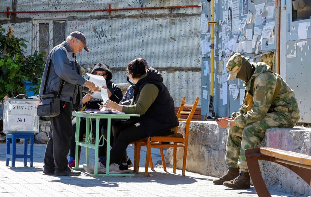 烏克蘭人和占領區親友聯繫後表示,在入俄公投這段期間,一群持卡拉希尼柯夫突擊步槍(Kalashnikov)男性,陪同一個攜帶著移動投票箱的人,在公寓大樓裡挨家挨戶敲門。根據UkraineWorld發布的影片顯示,攜有槍枝及行動票箱的人員在樓梯間走動。