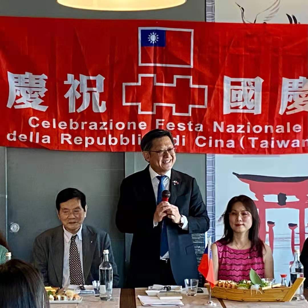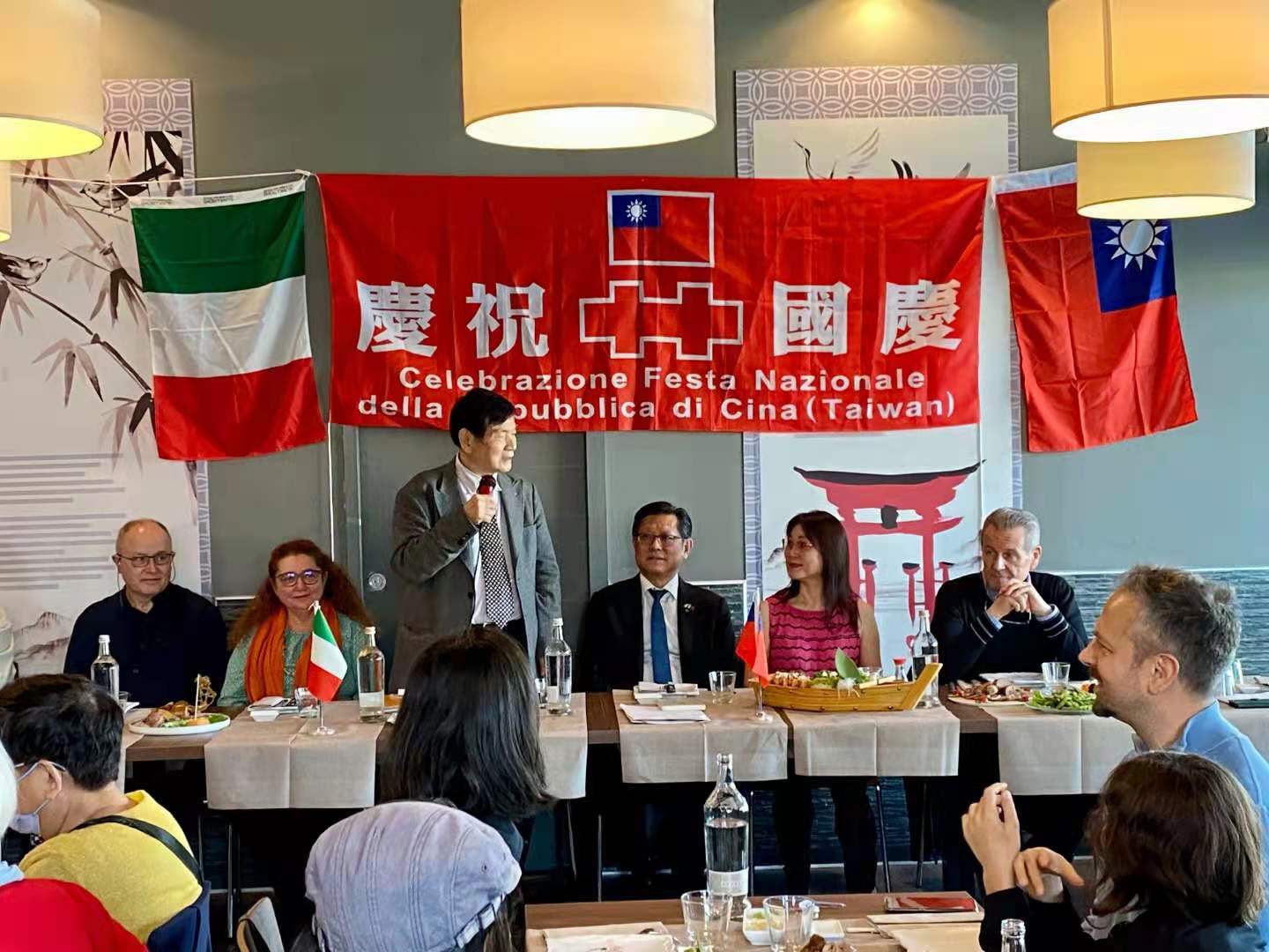 在典禮開始全體肅立高唱中華民國國歌及義大利國歌後,林副代表代表李新穎大使蒞臨主持並致詞,首先向僑胞及義大利貴賓致詞歡迎及恭賀111年國慶,及報告台灣與義大利多年來政治、文化、經濟⋯多方面的合作發展,及台灣在亞洲及世界成為國際矚目焦點,無論在經濟科技方面、亞太地區安全地位,維護亞太地區安全及世界和平的重要性,成為全球經濟和安全的重中之重!本市市長Lepore (雷波蕾)是我們僑社好朋友每次辦活動必參加,今天因公到外城未能趕回,特派交通局長兼黨團書記、市議員Claudio Mazzanti (馬占帝)參加並致詞,闡述僑社中華協會成立百年,是本市及大區(州)最享盛譽的社團,僑胞最團結、勤勞、守法,對城市貢獻良多,每年都辦理許多藝文活動,推動文化交流,生產力⋯對城市有很多貢獻。前任市長Merola (梅若拉)與僑界関係非常友好,每次都會出席參加僑社在市府舉辦的文化藝術活動,這次當選了國會議員比較忙,今天出席國會議員開議活動不能來還不忘來電致賀。波隆那大學教授二位代表出席今天國慶餐會,精通中文的Prof. Sabrina Ardizzoni (波大中文系教授)多年來與僑界合作無間。也用中義文致賀詞,她最近用英文還出版「客家文化與建築」一書。