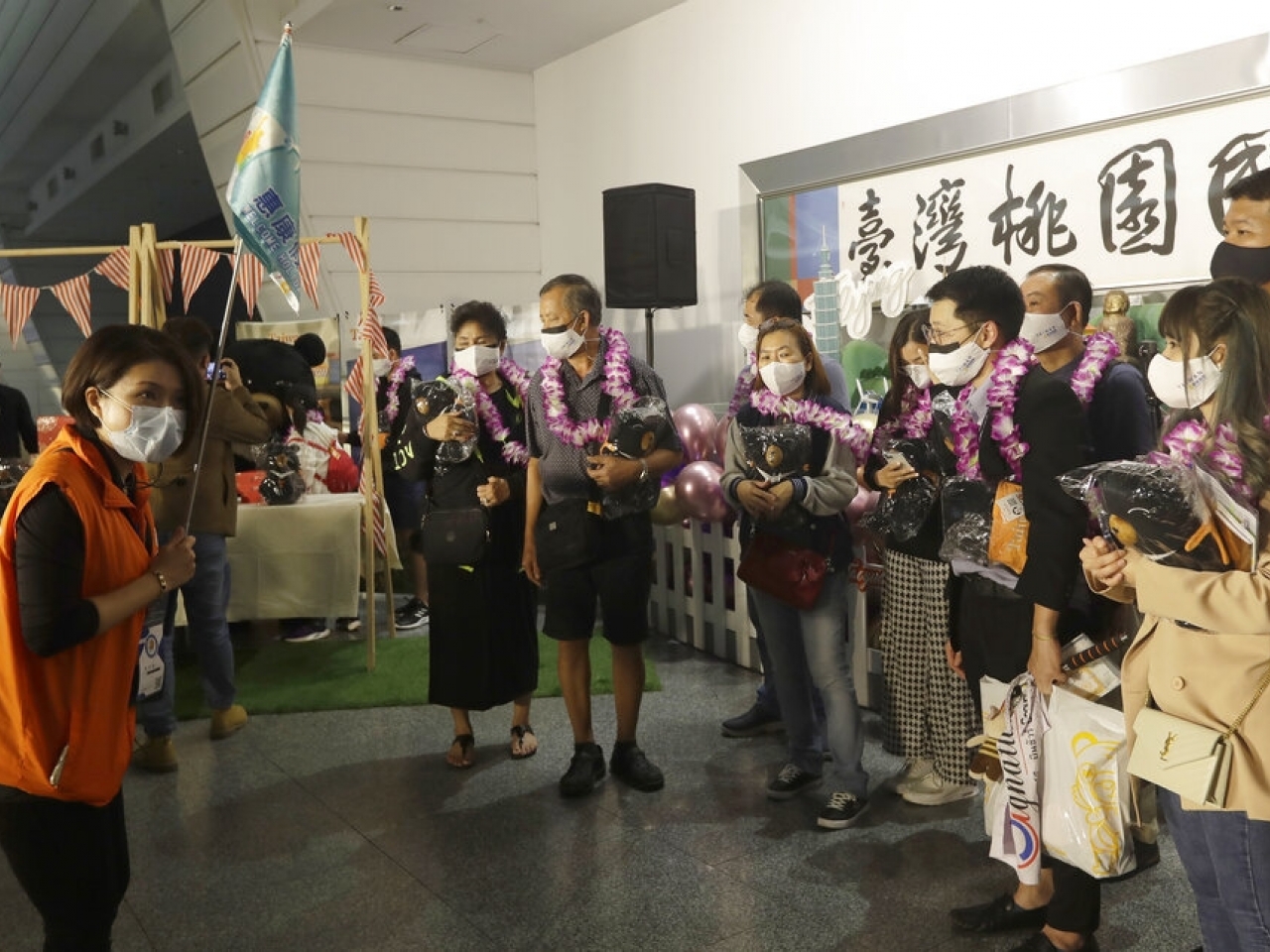 來自泰國的2個旅行團凌晨抵達台灣桃園機場。(美聯社)