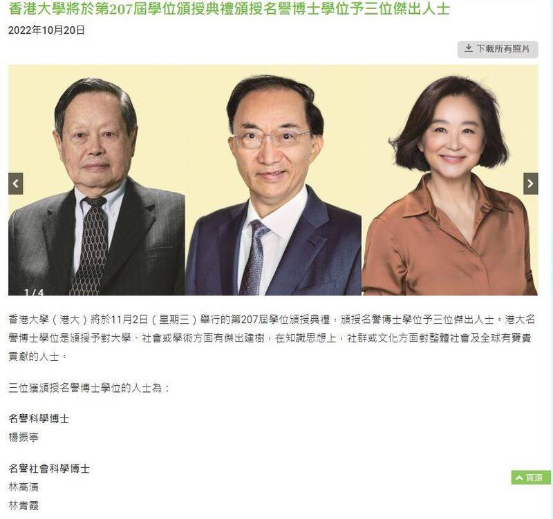 (中華新聞通訊社/中華時報香港訊)香港大學今(20日)在官網發布聲明,表示:「香港大學將於十一月二日(星期三)在本部大樓陸佑堂舉行第二百零七屆學位頒授典禮,頒授名譽博士學位予三位傑出人士,包括楊振寧教授、林高演博士及林青霞女士。名譽博士學位領受人楊教授現居於境外,未能出席此次典禮。」林青霞與林高演教授獲頒「名譽社會科學博士」學位,而楊振寧則是名譽科學博士學位。