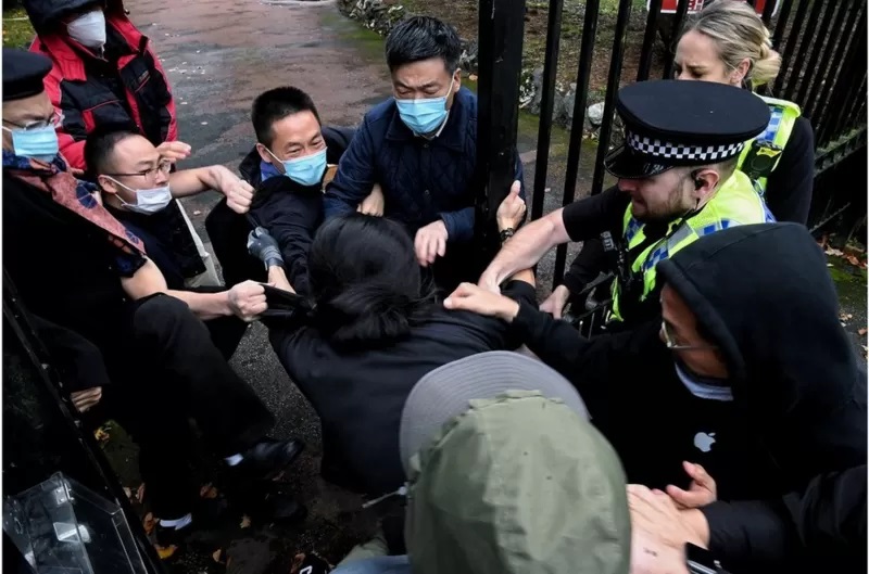 在倫敦,超過500名示威者在首相府外集會,遊行到1.6英里外的中國大使館。示威者又舉起一幅大型標語,要求“驅逐所有襲擊無辜示威Bob Chan的中共官員”。