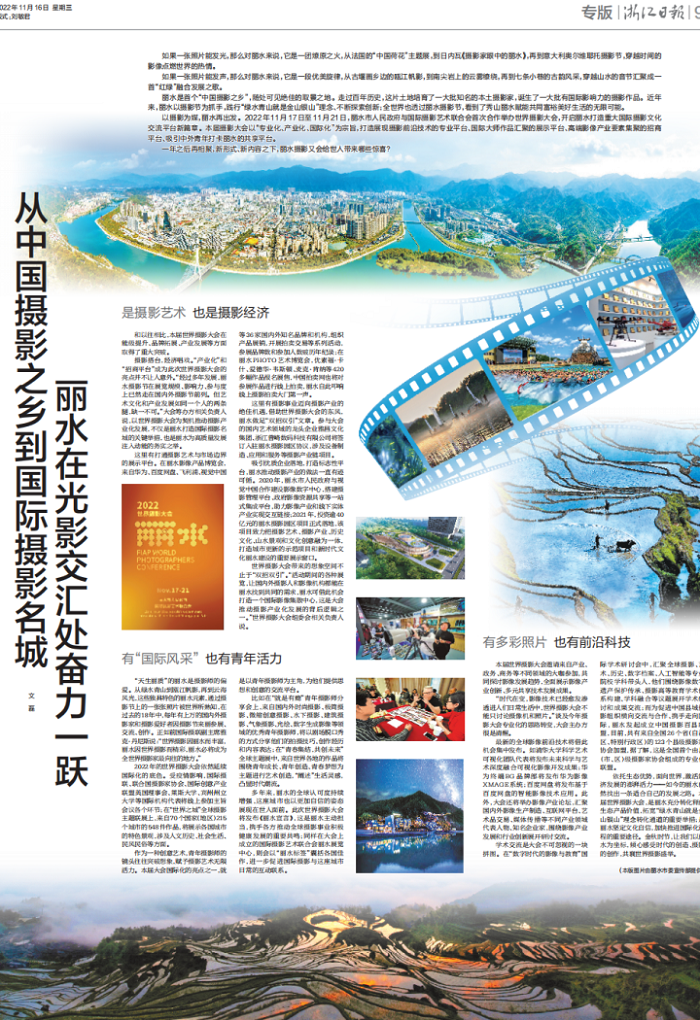 以攝影為媒,麗水再出發。2022年11月17日至11月21日,麗水市人民政府與國際攝影藝術聯合會首次合作舉辦世界攝影大會,開啟麗水打造重大國際攝影文化交流平台新篇章。本屆攝影大會以「專業化、產業化、國際化」為宗旨,打造展現攝影前沿技術的專業平台、國際大師作品彙聚的展示平台、高端影像產業要素集聚的招商平台、吸引中外青年打卡麗水的共享平台。