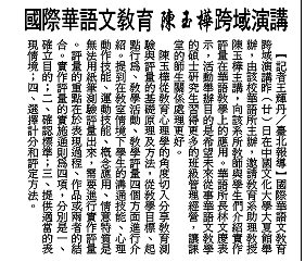 【記者王輝丹/臺北報導】國際華語文教育跨域演講昨(廿)日在中國文化大學大夏館舉辦,由該校華語所主辦,邀請教育系助理教授陳玉樺主講,向該系所教師與學生們介紹實作評量在華語教學上的應用。華語所長林文慶表示,活動舉辦目的是希望未來從事華語文教學的碩士研究生習得更多的班級管理經營,讓課堂的師生關係處理更好。