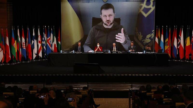 烏克蘭總統澤倫斯基受邀發表視訊致詞,他重申烏克蘭加入北約和歐盟的意願,並呼籲北約成員國協助保護札波羅熱核電廠免受俄羅斯攻擊。