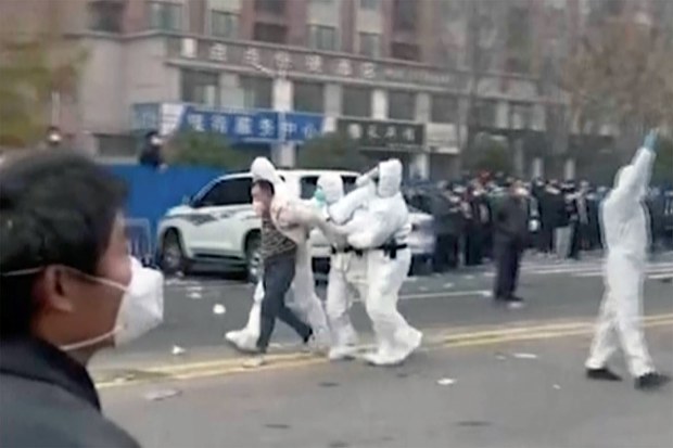 2022年11月23日,鄭州富士康爆出大規模衝突抗議期間,身穿防護服的安保人員帶走一人。