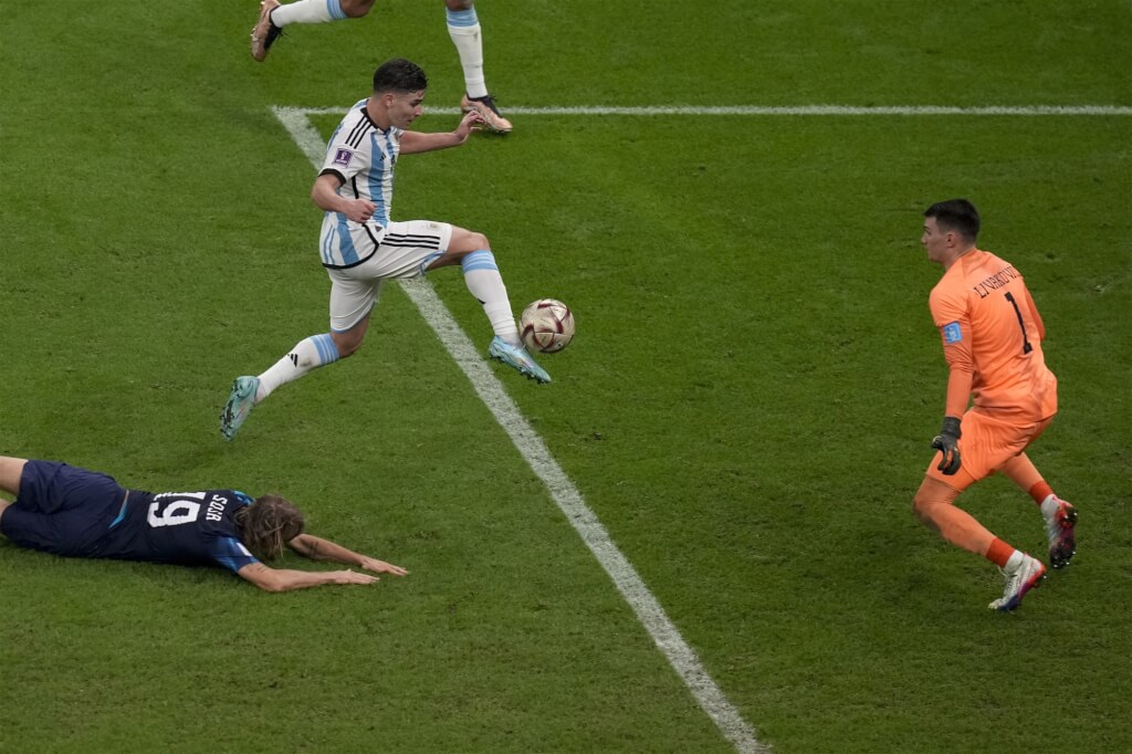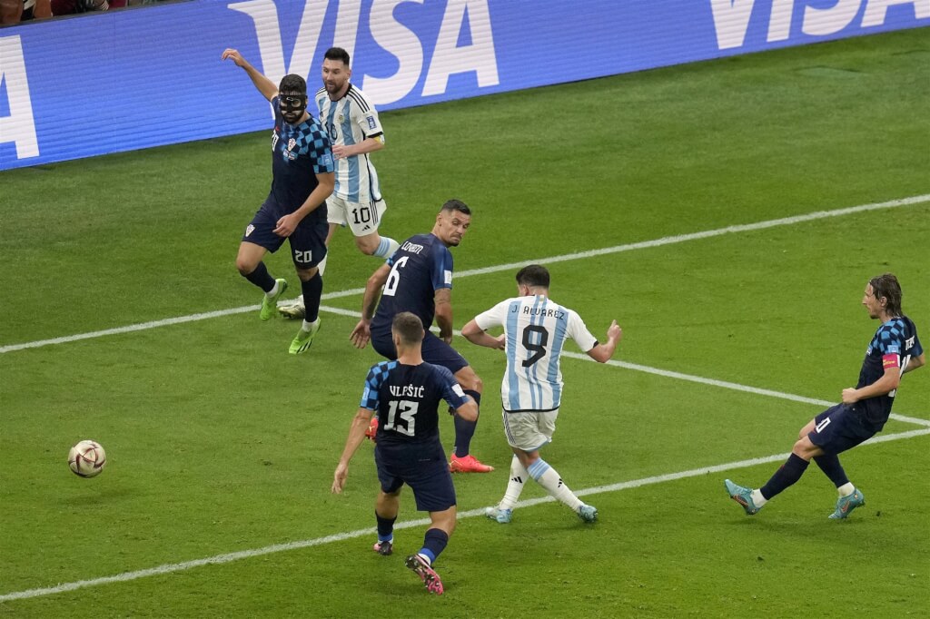 5分鐘後,阿爾瓦雷茲在中線附近接獲梅西傳球後帶球快速推進,突破克羅埃西亞防線,閃過3名守衛球員,在第39分鐘再進一球,上半場以2比0領先。