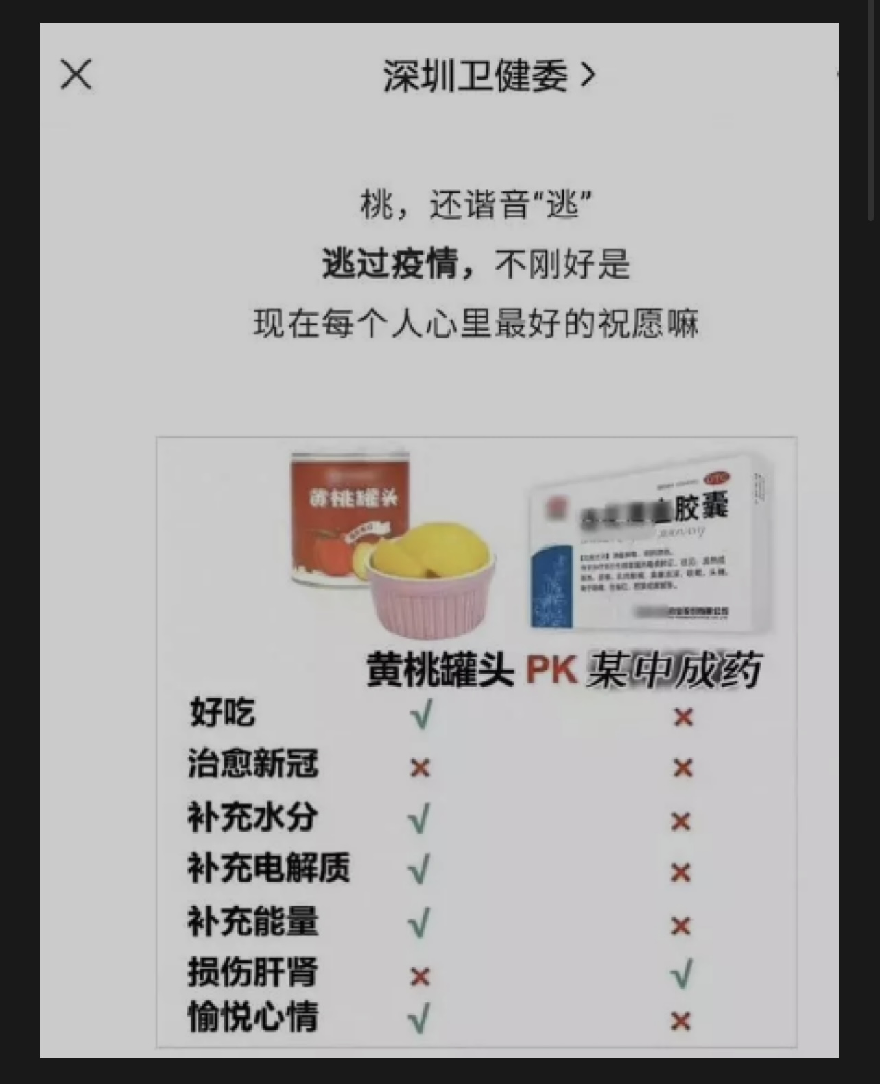 12月12日,深圳市衛健委微信公衆號文章中使用了一張黃桃罐頭和連花清瘟的對比圖,直指連花清瘟在損傷肝腎方面比黃桃罐頭“有效”,其他各項能力都不及黃桃罐頭。帖子獲熱轉之後,深圳衛建委刪除了整篇文章。