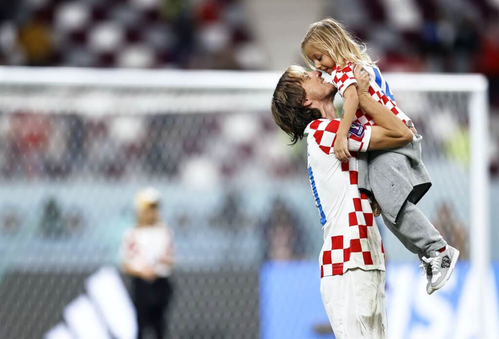 克羅地亞拿下世足季軍,莫德里奇(前左)抱起孩子慶祝。(共同社)