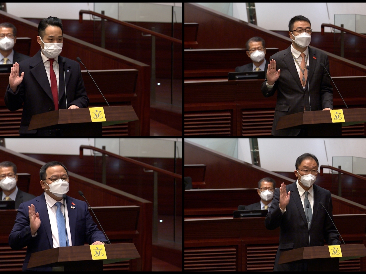 奏唱國歌後,四人先後宣誓,由行政長官李家超監誓,立法會主席梁君彥作見證。