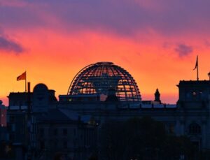 这是德国柏林晚霞映衬下的德国国会大厦(2022年11月4日摄)。(新华社记者任鹏飞摄)