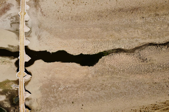 这是2022年8月15日用无人机拍摄的干涸的西班牙锡哈拉水库,上世纪50年代因水库落成而被淹没的梅斯塔古桥重见天日。西班牙2022年夏天经历多轮热浪,全国水库蓄水量不足40%。(新华社记者孟鼎博摄)
