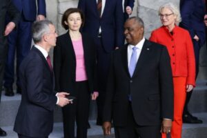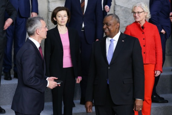 2022年2月16日,在比利时布鲁塞尔的北约总部,北约秘书长斯托尔滕贝格(左一)、法国国防部长帕利(左二)、美国国防部长奥斯汀(右二)及德国国防部长兰布雷希特(右一)参加北约国防部长会议。新华社记者郑焕松摄