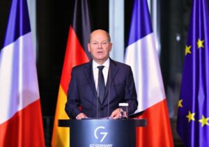 2022年11月25日,在德国柏林总理府,德国总理朔尔茨同法国总理博尔内(未在画面中)出席新闻发布会。新华社记者任鹏飞摄
