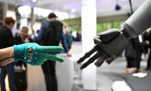 2022年5月30日,在德国汉诺威工业博览会上,一款可感知人类手势的智能机器人(右)与观众互动。(新华社记者任鹏飞摄)