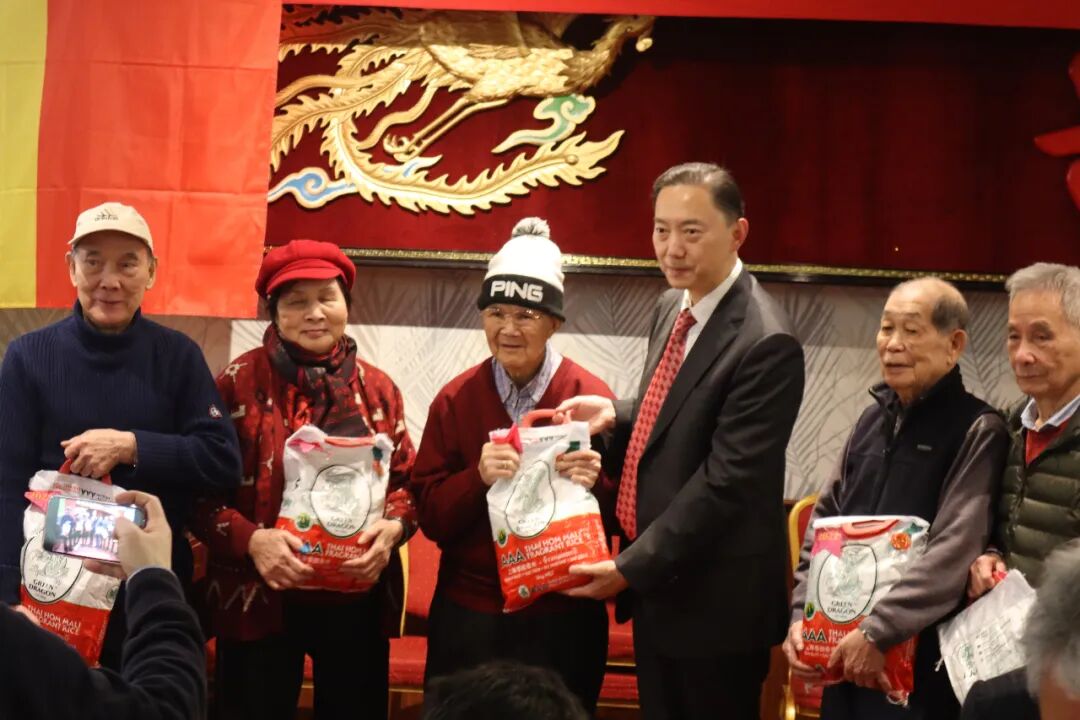 宴会进行到一半的时候,庾春花女士按照旅比华侨联合会的传统,为70岁以上的老人赠送了福米,吴刚公参亲自将大米送到了老人们的手中,也为老人们送去了关爱与祝福。嘉宾们也为中华民族的敬老传统所感动。
