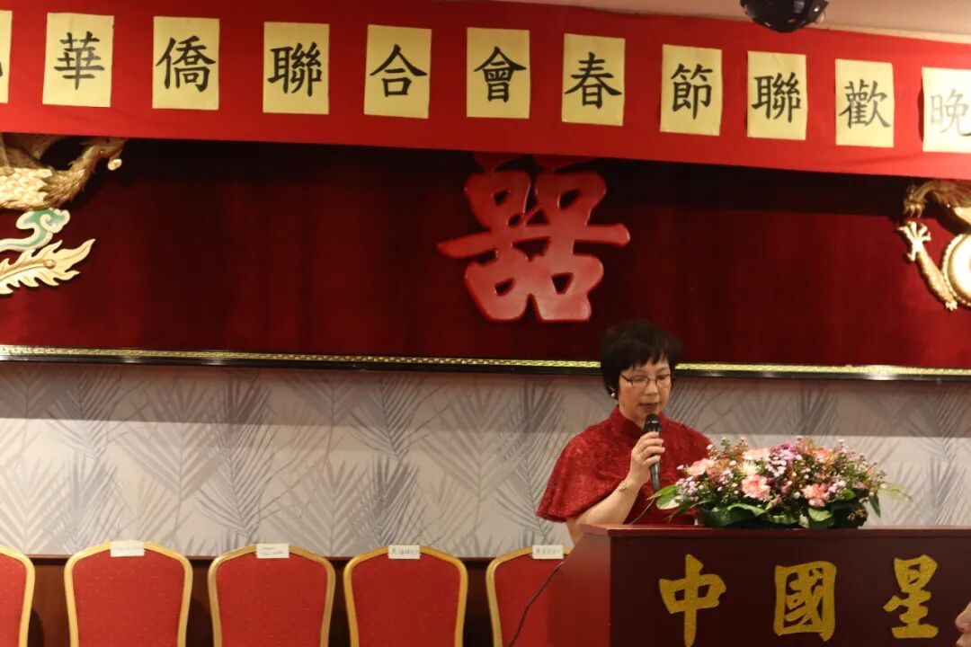 旅比华侨联合会主席庾春花女士感谢了各方在过去一年对于联合会和旅比华人的支持,而后回顾了过去一年联合会的工作事宜,着重讨论了唐人街的照明问题和华联会经营税问题的顺利解决,而后她向大家致以了新春祝福。