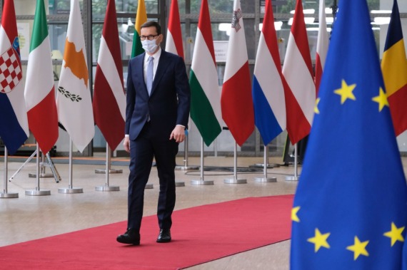 2021年10月21日,波兰总理莫拉维茨基抵达位于比利时布鲁塞尔的欧盟总部。新华社发(欧盟供图)