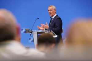 2022年6月16日,在比利时布鲁塞尔的北约总部,北约秘书长斯托尔滕贝格在北约成员国国防部长会议后的新闻发布会上发言。新华社记者郑焕松摄