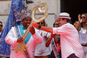 金钥匙交接是每年里约狂欢节启动的传统仪式,象征在节日期间整座城市都由“狂欢节国王”接管,其任务是与“王后”和两名“公主”一起在各项狂欢活动中带领市民和游客载歌载舞、共同狂欢。