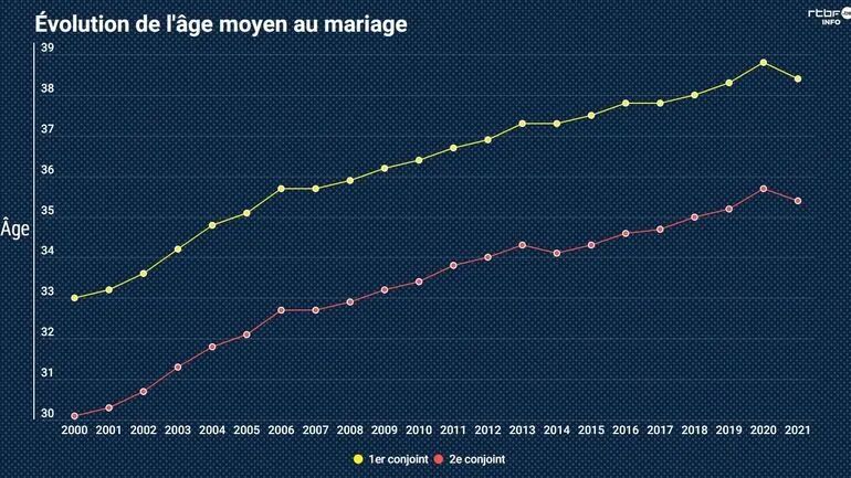 相比2000年,人们结婚的时间要晚五年,比利时统计局公布的图表清晰地展现了这一现状: