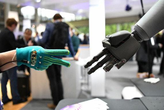 2022年5月30日,在德国汉诺威工业博览会上,一款智能机器人与观众互动。该智能机器人可感知一定空间范围内人的手势,并作出相同的手势。(新华社记者任鹏飞摄)