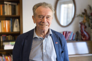 这是2019年2月25日拍摄的英国知名社会学家马丁·阿尔布劳在伦敦接受采访时的资料照片。(新华社记者韩冲摄)