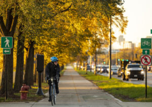 2021年11月2日,一名男子在美国芝加哥湖边小道骑行。新华社发(乔尔·莱纳摄)