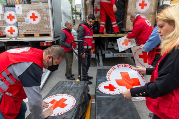 2月10日,红十字会工作人员在希腊雅典准备将救援物资装车。土耳其南部靠近叙利亚边境地区6日发生强烈地震后,世界多地积极为震区提供援助。新华社发(马里奥斯·罗洛斯摄)