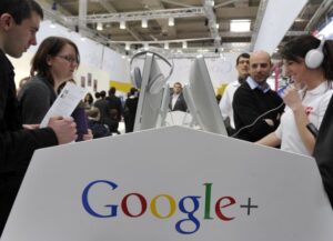 这张资料照片显示,2012年3月6日,在德国汉诺威会展中心举行的汉诺威信息及通信技术博览会上,参观者在谷歌展台参观。(新华社记者马宁摄)