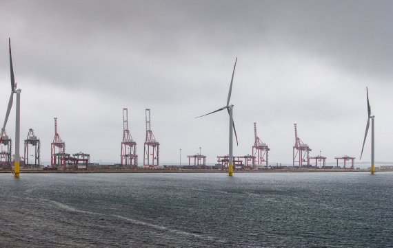 这是2022年4月21日在意大利南部港口塔兰托拍摄的海上风力发电机组。新华社记者刘咏秋摄