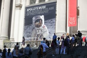 这是2019年7月1日在美国纽约大都会博物馆拍摄的纪念阿波罗11号飞船登月50周年月亮摄影特展大幅海报。(新华社记者王迎摄)