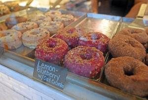 这是2019年9月12日在美国纽约一家甜甜圈店拍摄的燕麦粉柠檬-蓝莓口味的甜甜圈(中)。新华社记者李睿摄