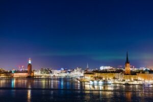 这是2022年2月10日在瑞典首都斯德哥尔摩市中心拍摄的北极光。新华社发(魏学超摄)