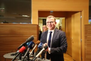 芬兰4月2日举行四年一次的议会选举。芬兰司法部当天晚间公布的初步统计结果显示,芬兰民族联合党在选举中获胜,击败总理马林领导的社会民主党,成为议会第一大党。这是民族联合党主席彼得里·奥尔波当天在赫尔辛基接受记者采访。(新华社记者陈静摄)
