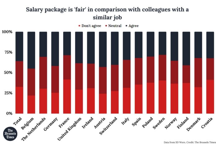 人力资源提供商SD Worx最近对 16,011 名欧洲人进行的一项研究证实,比利时居民对其薪资待遇的公平性最为满意,因为几乎二分之一的工人 (45%) 认为自己的薪资与同事的薪资一致。这远高于 SD Worx调查的其他15个国家记录的水平。