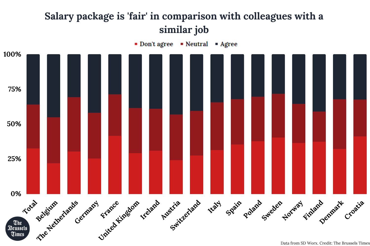 比利时近一半的就业人口认为,与同事或该行业其他人相比,他们的薪酬是公平的,这使该国领先于欧洲其他国家。