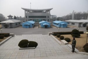 这是2019年3月5日拍摄的朝鲜板门店共同警备区内的军事分界线和附近建筑。新华社记者程大雨摄