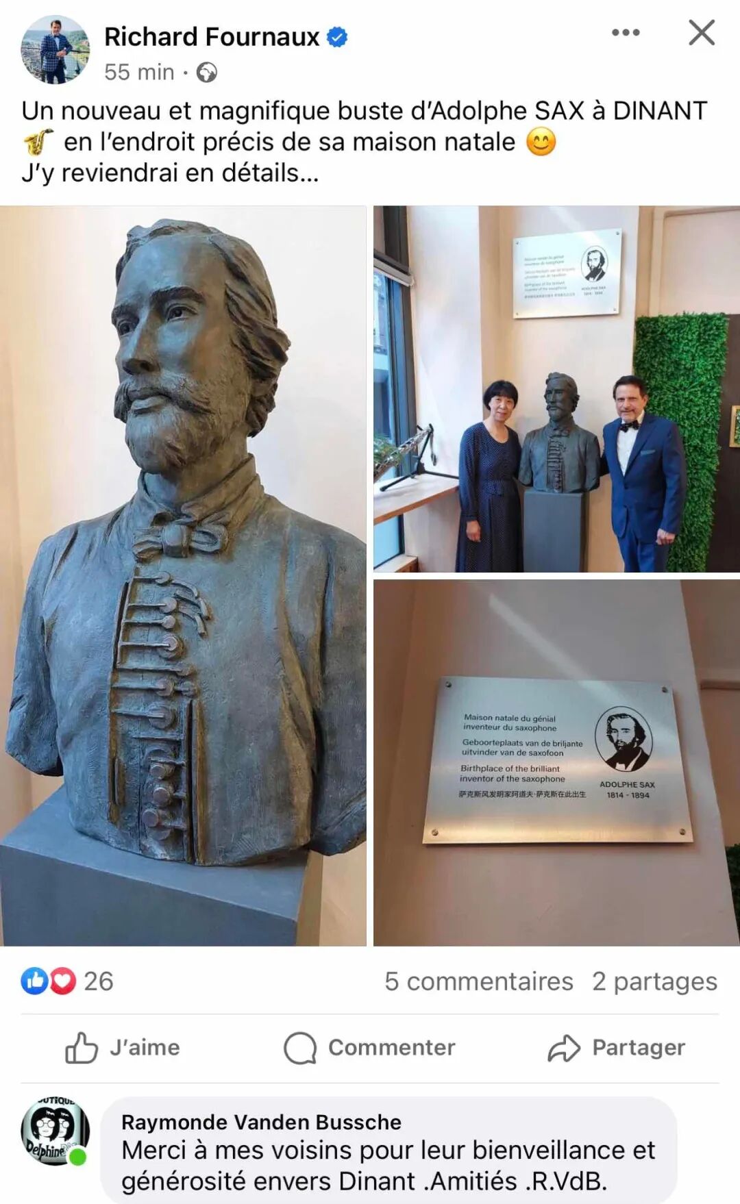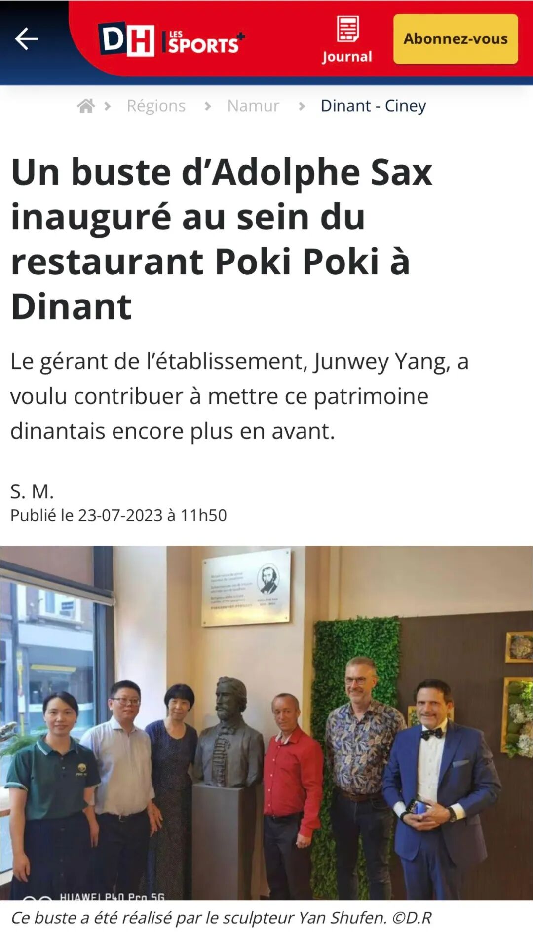 据悉,阿道夫萨克斯先生就出生在比利时迪南,如今,他的出生地(故居-博物馆隔壁)被当地华商杨军伟夫妇买下,改建为亚洲餐厅和民宿,新落成的半身像在餐厅一角。
