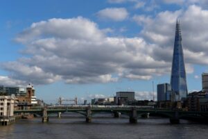 这是2015年9月27日在英国伦敦拍摄的泰晤士河南岸的“碎片大厦”(右)以及远处的伦敦塔桥。(新华社记者韩岩摄)
