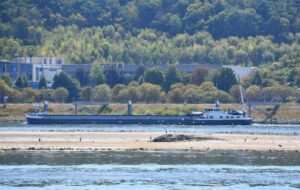 2022年8月16日,在德国黑森州吕德斯海姆,货船行驶在莱茵河上。新华社记者任鹏飞摄