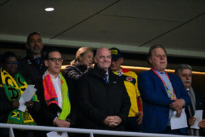 8月8日,国际足联主席因凡蒂诺(前中)在现场观看女足世界杯八分之一决赛。新华社记者 朱炜 摄