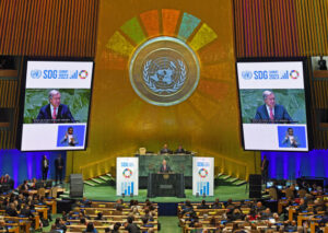 9月18日,在位于纽约的联合国总部,联合国秘书长古特雷斯在联合国可持续发展目标峰会上讲话。(新华社记者李睿摄)