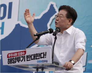 7月1日,韩国最大在野党共同民主党党首李在明在首尔举行的“谴责福岛核污染水海洋排放泛国民大会”上发言。新华社发(李相浩摄)