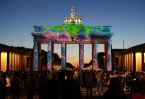 2022年10月7日,德国柏林勃兰登堡门被灯光点亮。新华社发(斯特凡·蔡茨摄)
