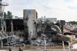 10月8日,在以色列南部城市斯代罗特,以军将哈马斯武装人员曾躲藏的警察局办公楼拆除。新华社/基尼图片社