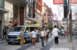 8月17日,一辆警车停在瑞典首都斯德哥尔摩市中心的步行街上。新华社发(魏学超摄)