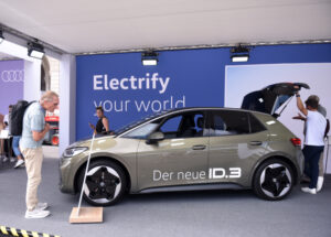 2023年9月13日,观众在奥地利维也纳电动汽车日活动现场参观一辆大众电动车。新华社记者贺灿铃摄