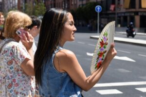7月10日,一名女子在西班牙马德里街头扇扇子降温。新华社发(古斯塔沃·巴连特摄)