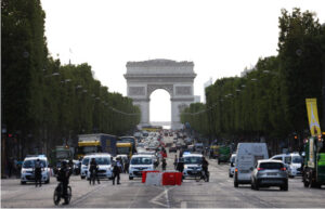 7月2日晚间,警察在法国巴黎香榭丽舍大道上封路巡逻。新华社记者高静摄